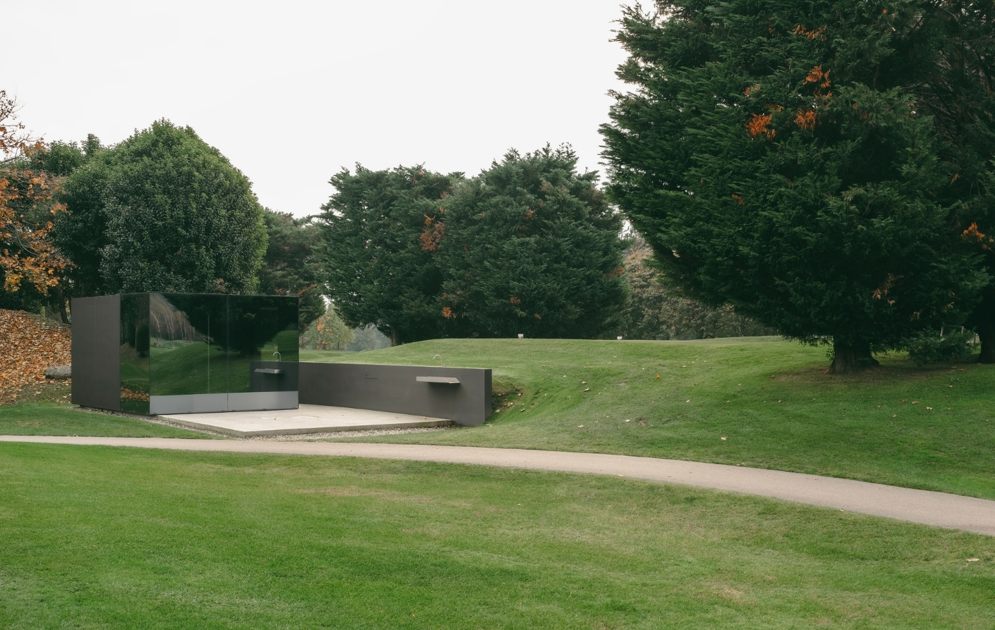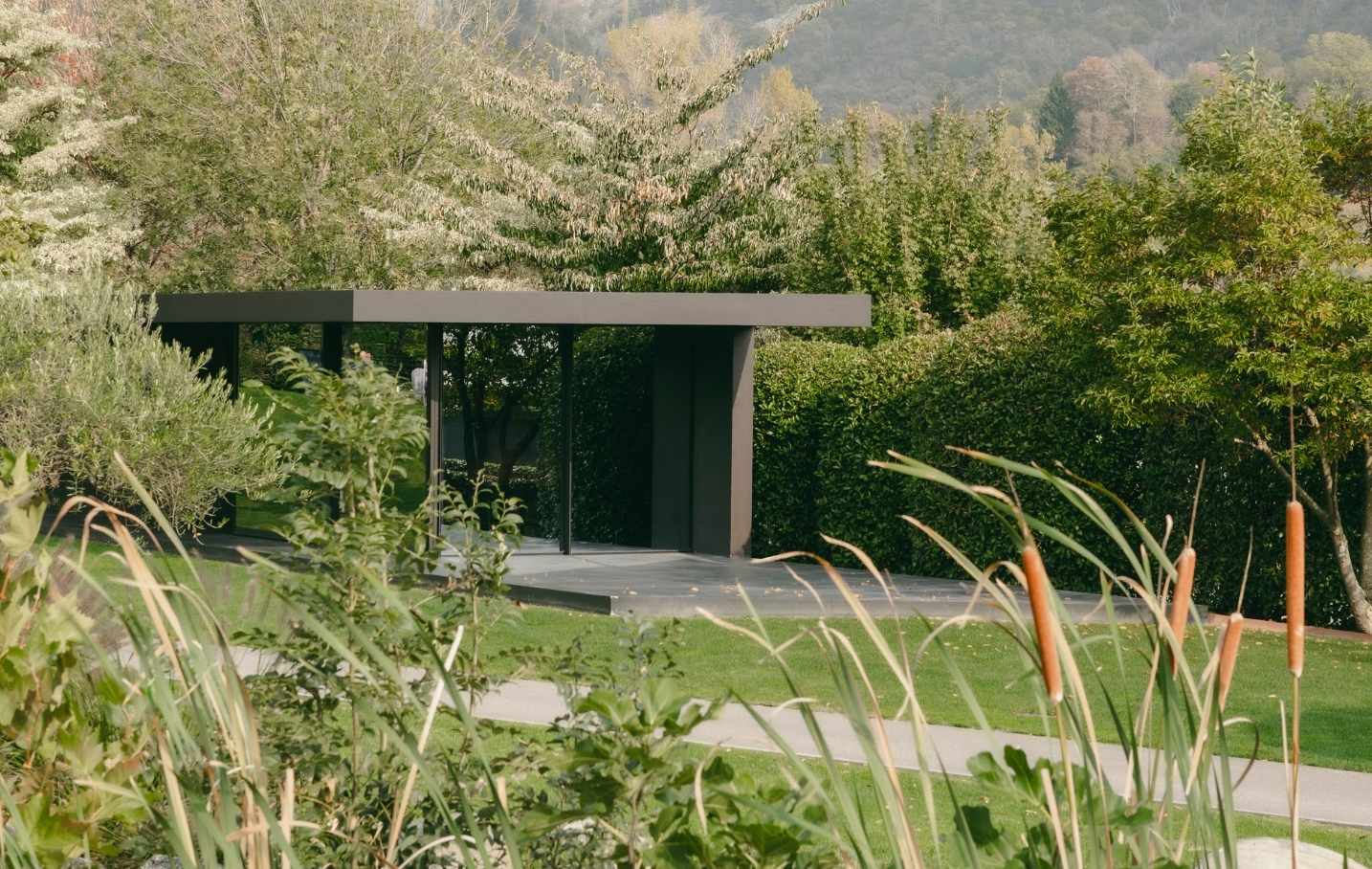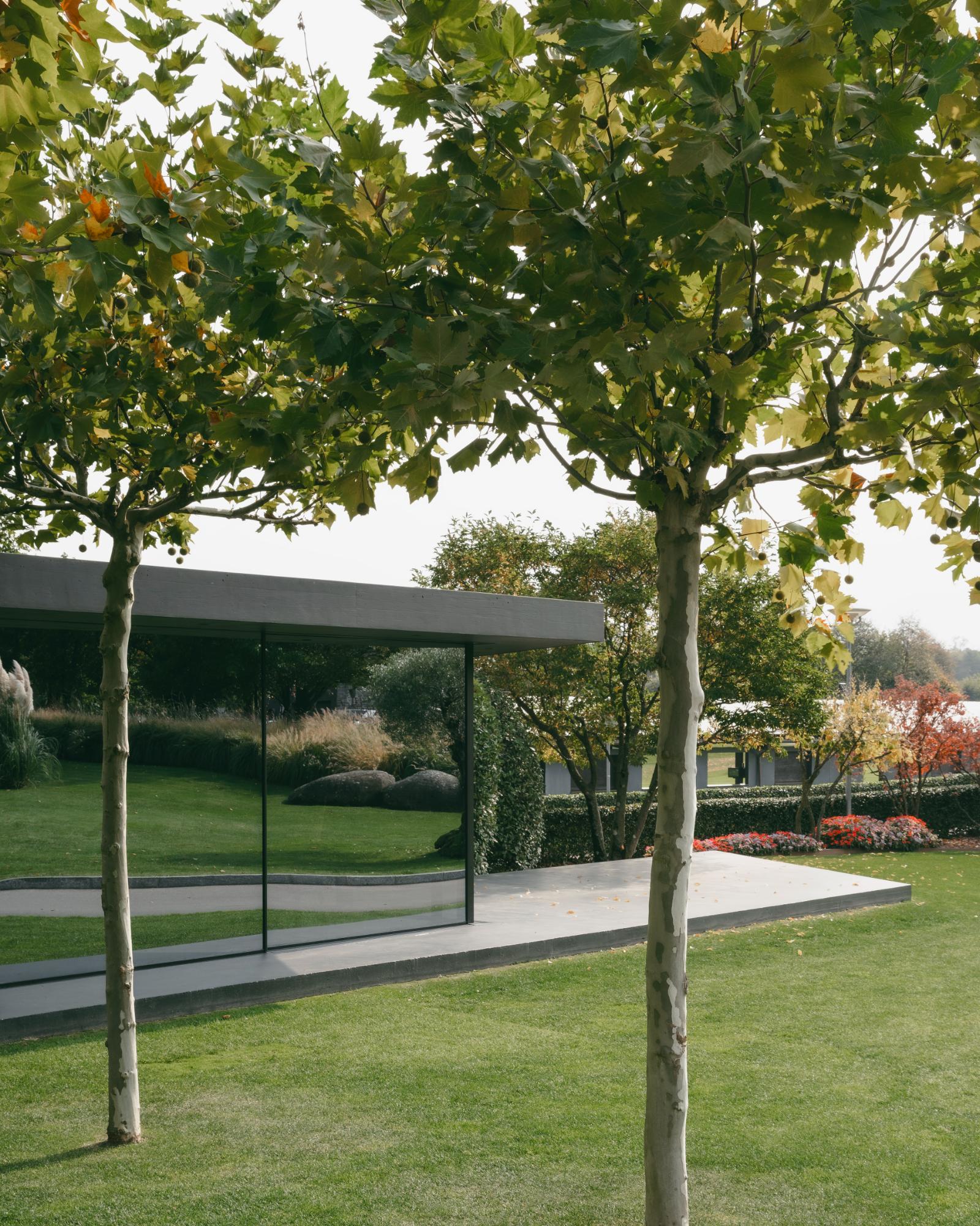 I manufatti si configurano come volumi compatti e sobri, caratterizzati da una combinazione di calcestruzzo con velatura nera, che conferisce uniformità e profondità materica all'insieme, e ampie vetrature a specchio, in grado di riflettere il contesto naturale circostante e di ridurre l'impatto visivo delle costruzioni.